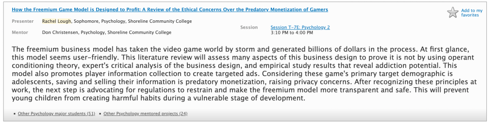 As a community college student, I was selected to participate in the University of Washington’s 2021 Undergraduate Research Symposium. Under the guidance of Shoreline Community College’s esteemed Honors program, I delivered a presentation on my research capstone, which investigated the Freemium game model and its utilization of gambling techniques, operant conditioning, and manipulation to entice children to spend excessive amounts of money that they may not have otherwise.